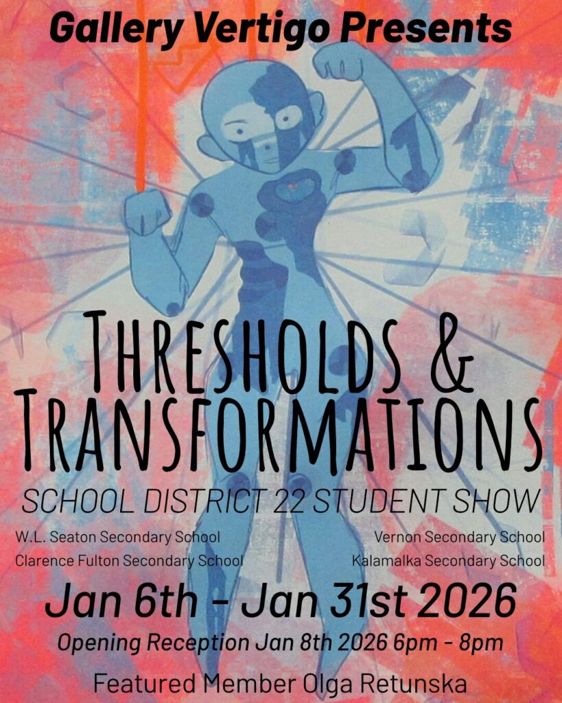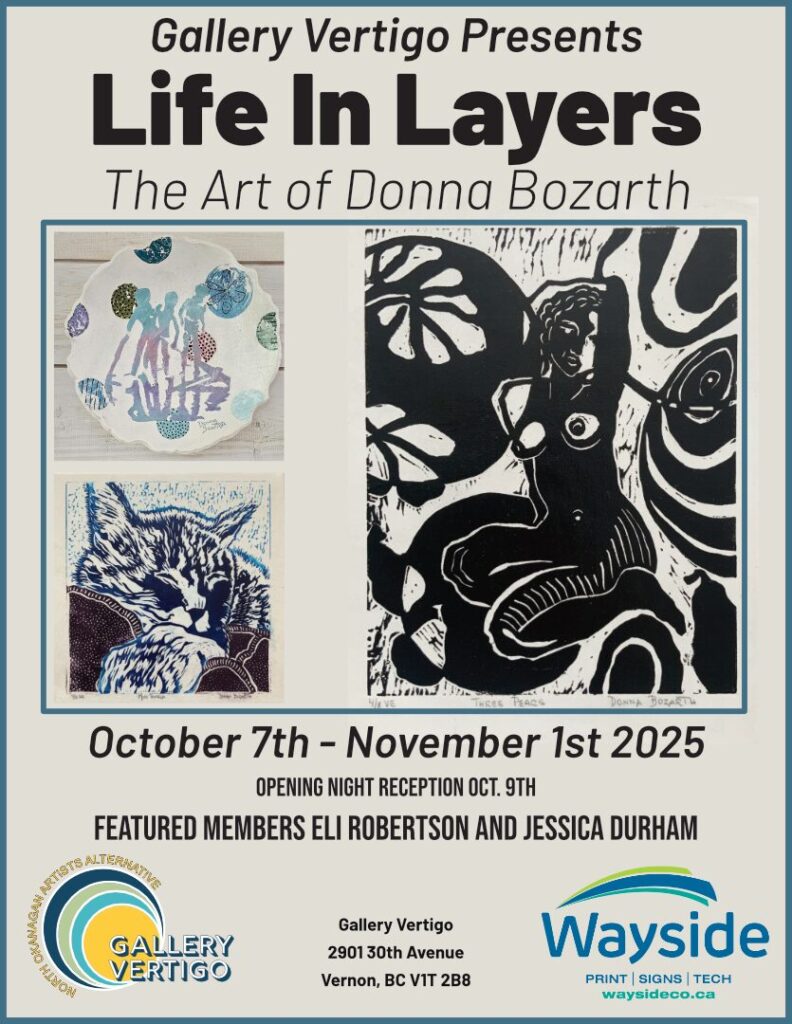 We welcome you to stop by, visit our gallery spaces, and chat with our studio artists. Conversation is the heart of Gallery Vertigo and the NOAA. We are located across the street from the Vernon Towne Theatre at 2901 – 30th Avenue, Vernon BC.