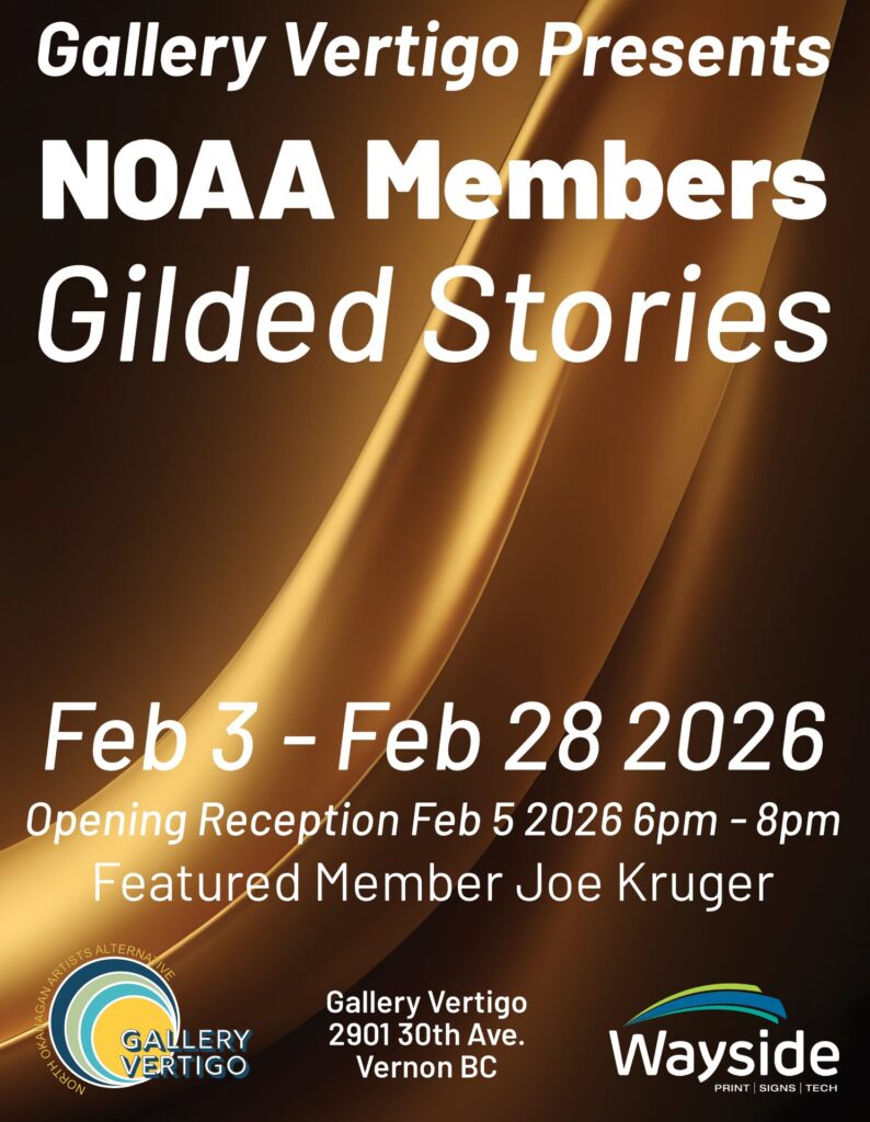 Each year, members of the North Okanagan Artists Alternative (NOAA)—the artist-run society that operates Gallery Vertigo—are invited to come together for a pair of member exhibitions that celebrate the depth and diversity of our creative community. Our membership reflects a wide range of practices and perspectives, united by a shared passion for the arts and for expressing individual artistic vision. The works in this exhibition span photography, watercolour, printmaking, textiles, acrylics, oils, sculpture, and clay, offering visitors a rich and engaging experience of contemporary artistic exploration.